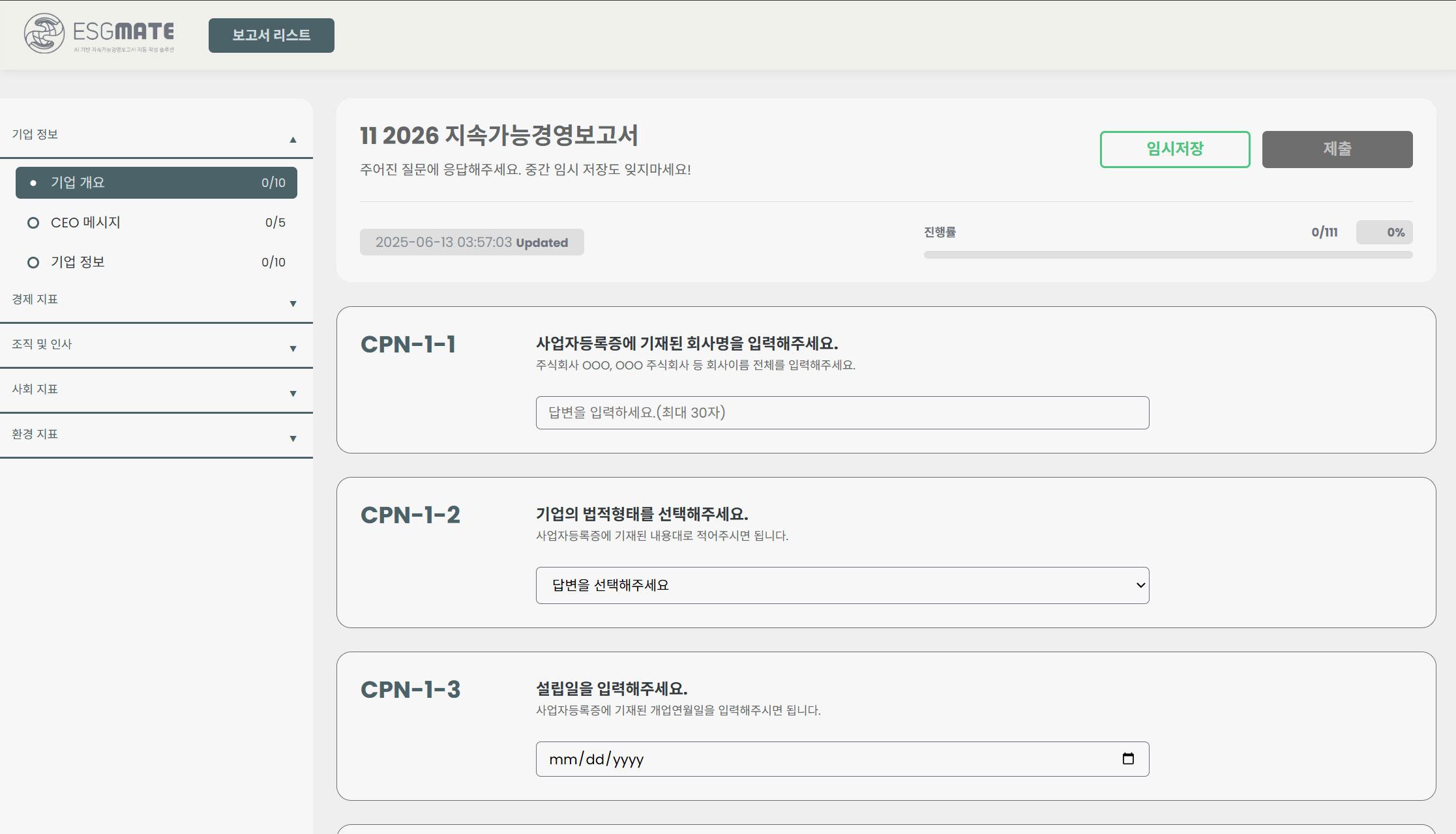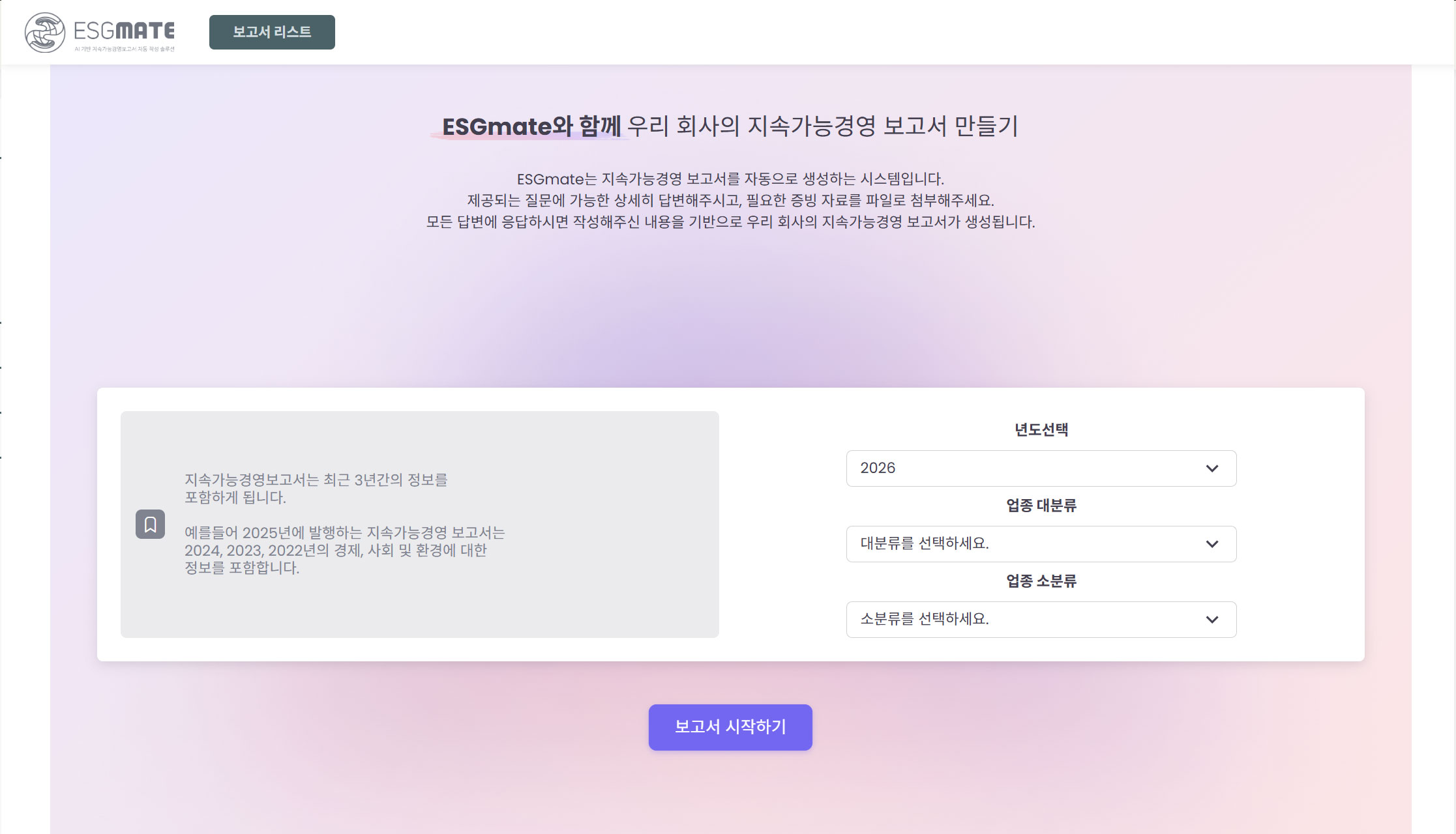 우리는 기업이 복잡한 ESG 보고서를 직접 작성하거나 외부 전문가에게 의존하지 않아도 되도록, 설문 입력만으로 규격에 맞는 ESG 보고서를 자동 생성하는 올인원 AI 솔루션을 구축했습니다. 사내 관리자가 기본 정보를 입력하면 AI가 국제 표준에 맞춘 보고서를 완성하며, 초안 작성부터 편집·정리, 최종 문서 생성까지 모든 과정을 하나의 플랫폼 안에서 처리할 수 있습니다. 완성된 보고서는 ESG 전문 검토자의 피드백을 거쳐 품질을 보증받고, 기업은 수정 없이 바로 제출할 수 있는 최종 결과물을 제공받습니다.